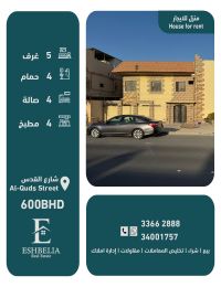We have a luxurious and very clean house for rent in a prime area in Isa Town, located directly on Al-Quds Street and near the health center. It consists of (4) apartments: Group A includes one apartment with 2 bedrooms, bathroom, kitchen, and living room. Group B consists of (3) apartments with one bedroom, living room, bathroom, and kitchen. All apartments are large and spacious with many parking spaces available in front of the house. The requested price is 600 dinars, not inclusive. For contact: B201804 / 0125 license number. Ad number (97).