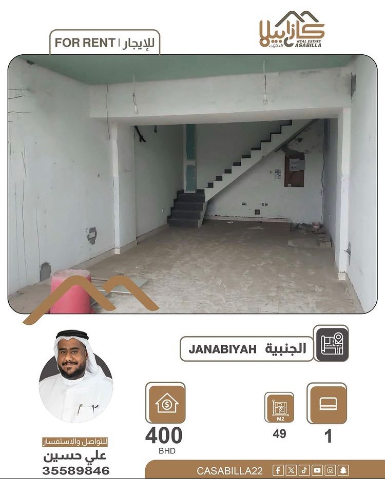Commercial shop for rent in Janabiya - Janabiya Square Complex. A great opportunity to start or expand your project in a vital and distinguished location in Janabiya, inside the Janabiya Square Complex. Shop details: Ground area 10.5m x 4m = 42m² - Mezzanine 7m x 4m = 28m² - Additional area (Overhang) 2m x 10.5m = 21m² - Total mezzanine area 49m². Rent 400 Bahraini Dinars per month. Excellent location suitable for many commercial activities such as cafes, specialized shops.