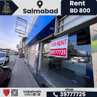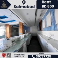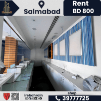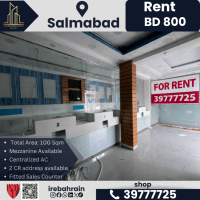 A commercial space ready for immediate delivery for rent in Salmabad. Rent is 800 Bahraini Dinars per month (negotiable). Prime location near the Mosque roundabout and Mercedes service center. Total area is 100 square meters (50 square meters ground floor + 50 square meters mezzanine floor). Two wooden doors. Mezzanine floor available. Fully equipped space with central air conditioning. Equipped sales table. Storage available. Suitable bathroom. Suitable for financial services, trade, and retail. Two registered commercial addresses. Two dedicated parking spaces.