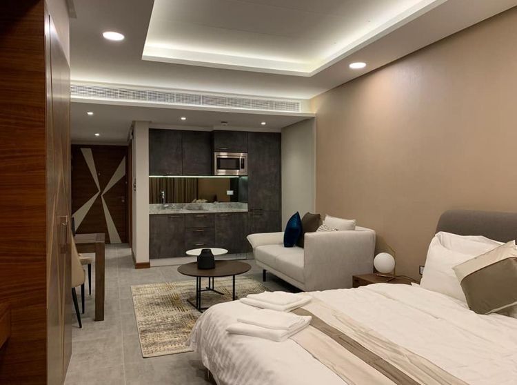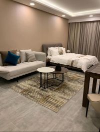 Luxury studio for rent in Al Hidd Heights. Area 45 square meters. Rent 250 Bahraini Dinars per month + one month security deposit. Includes electricity and water up to 20 Dinars. Specifications: fully furnished studio with luxurious furniture, upscale building with full services, very elegant reception hall, private parking, 24-hour security system and surveillance cameras, swimming pool, gym (men and women), jacuzzi and sauna, outdoor children's playgrounds, children's playroom + electronic games, aerobics hall, reference.