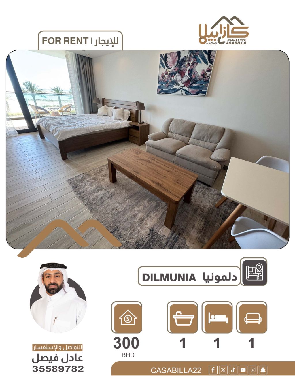 استوديو فاخر للإيجار في جزيرة دلمونيا بإطلالة خلابة وحياة راقية. عش تجربة السكن العصري في أرقى جزر البحرين. استوديو أنيق يتميز بتصميمه المتكامل وتجهيزاته الفاخرة، مما يجعله الخيار الأمثل لمن يبحث عن الهدوء والرفاهية في موقع استراتيجي. مفروش بالكامل، حمام واحد، مطبخ واحد. الإيجار الشهري: 300 دينار. للتواصل والاستفسار.