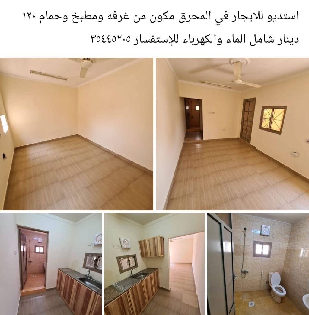 استوديو للإيجار في المحرق مكون من غرفة ومطبخ وحمام، 120 دينار شامل الماء والكهرباء