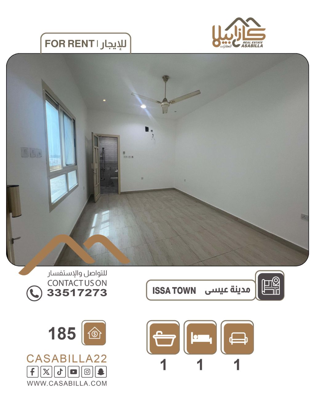 للإيجار: استوديو في مدينة عيسى، قرب وكالة تويوتا. التفاصيل: غرفة نوم، مطبخ مغلق، حمام، صالة. يشمل الكهرباء والماء. مصعد، بارك مظلل، بناية نظيفة، موقع هادئ وآمن، قريب من جميع الخدمات (محلات، مطاعم، مستشفيات). الإيجار 185 دينار شهرياً يشمل الكهرباء والماء. عربون 35 دينار. للتواصل.