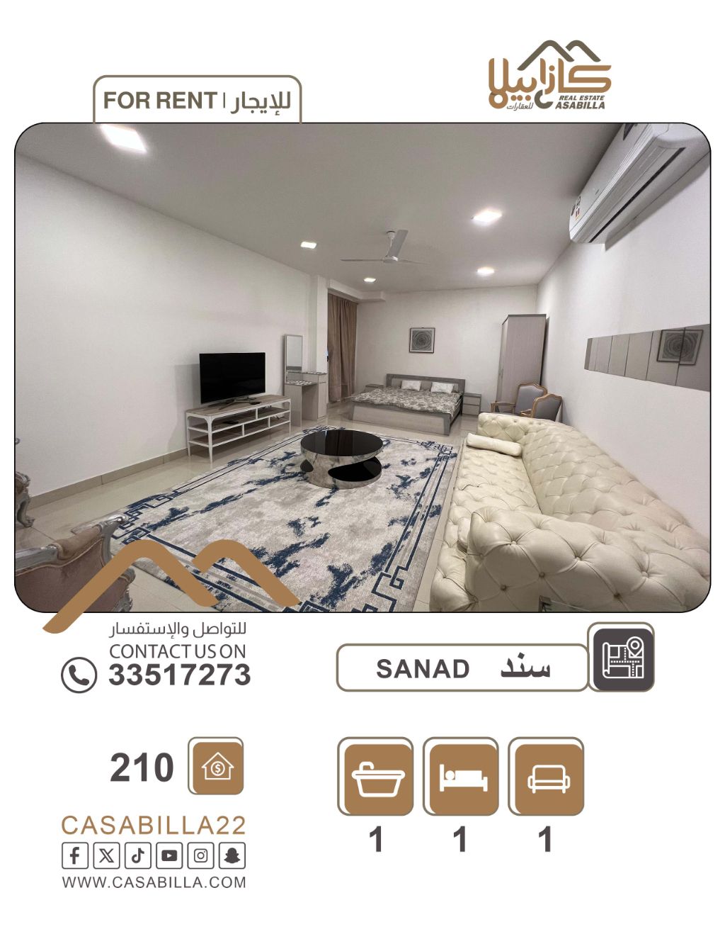 للإيجار: استوديو مفروش بالكامل وراقٍ في سند، قريب من مكتب البريد. يشمل غرفة مع مطبخ وحمام، وصالة، ويغطي الكهرباء والماء. البناية جديدة، تقع في منطقة هادئة وآمنة، قريبة من جميع الخدمات (محلات، مطاعم، مستشفيات، مواصلات). الإيجار 210 دينار شهرياً، شامل الكهرباء والماء. للتواصل.