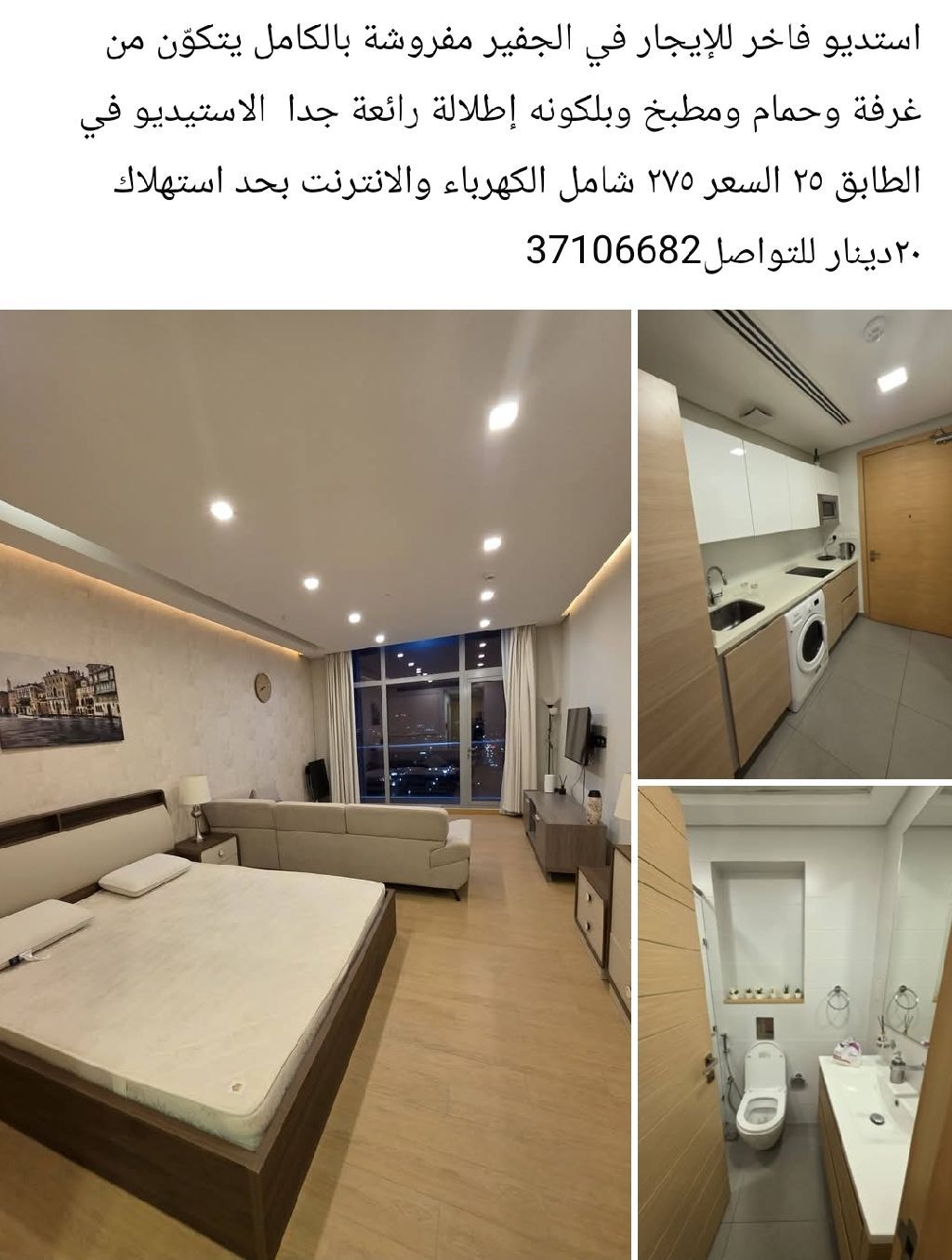 استوديو فاخر للإيجار في الجفير، مفروش بالكامل، يتكون من غرفة وحمام ومطبخ وبالكونة باطلالة رائعة جدا. الاستوديو في الطابق 25. السعر 275 دينارا بحرينيا شاملا الكهرباء والانترنت بحد استهلاك 20 دينارا. للتواصل
