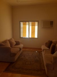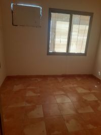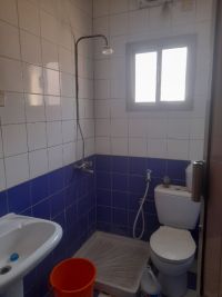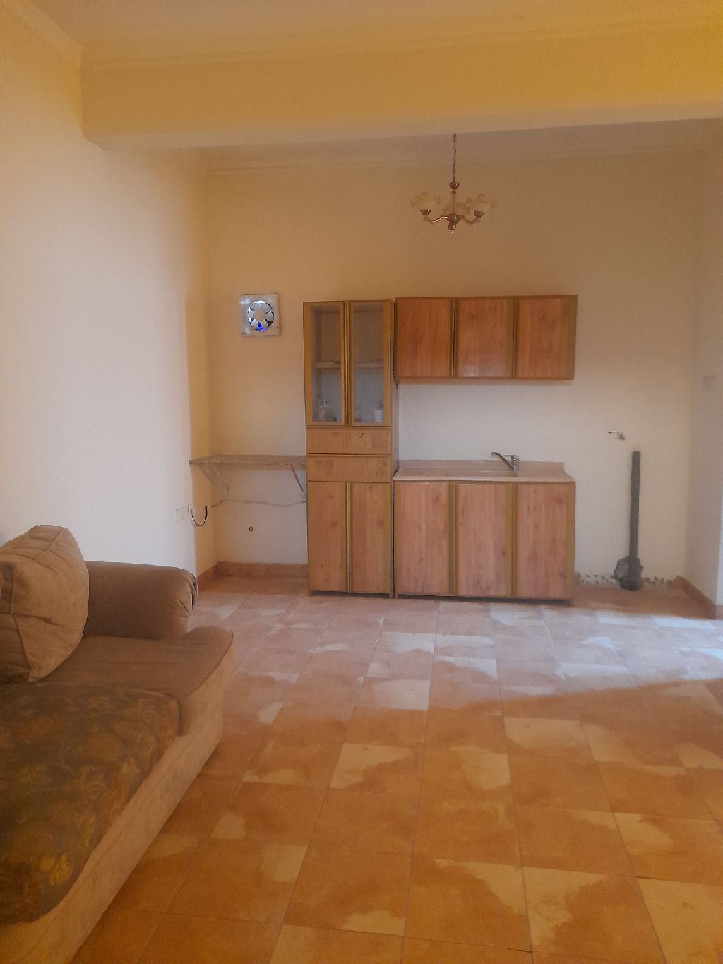 An apartment for rent with one bedroom, one bathroom, one living room, one kitchen, and a large rooftop on the top floor. Includes air conditioning. 150 dinars with electricity. Located in Jid Ali, near all services.