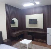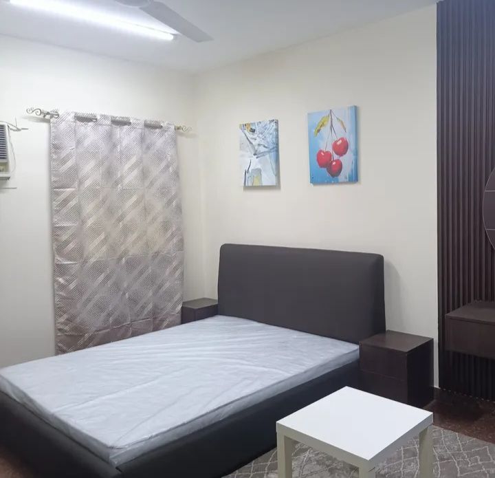 For rent, a fully furnished studio in Bahair - near the petrol station. Large bedroom, closed kitchen, bathroom, bed, curtains, dining table, chairs, air conditioner, refrigerator, washing machine, oven, central satellite. 220 Bahraini dinars including electricity and water