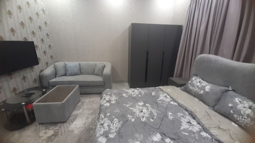 Elegant studio for rent in Jid Ali, featuring a room, bathroom, kitchen, and elevator. Only foreign students (male or female) are required. Price is 180 dinars, including electricity