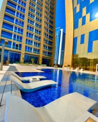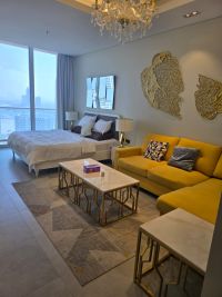 For rent, an apartment in Seef, Cata Maran 1 Tower, with a view of the sea and the city. It has one bedroom, one bathroom, and a kitchen. The area is 50 square meters with a city view. No internet included. EWA 20BD. The rent is 325 dinars per month, with a deposit of one month's rent and one month's rent in advance.