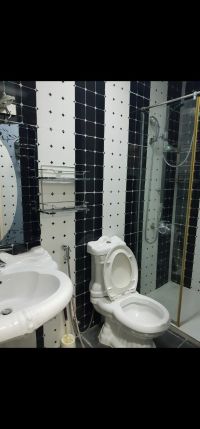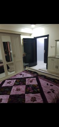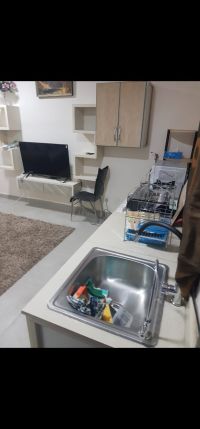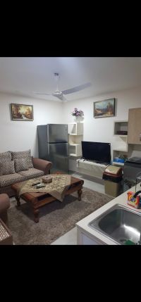 Furnished studio for rent in Sanad, with a room, bathroom, and open kitchen connected to the living room. Includes a garage. Price is 180 dinars, inclusive of electricity. Foreign student or employee preferred.