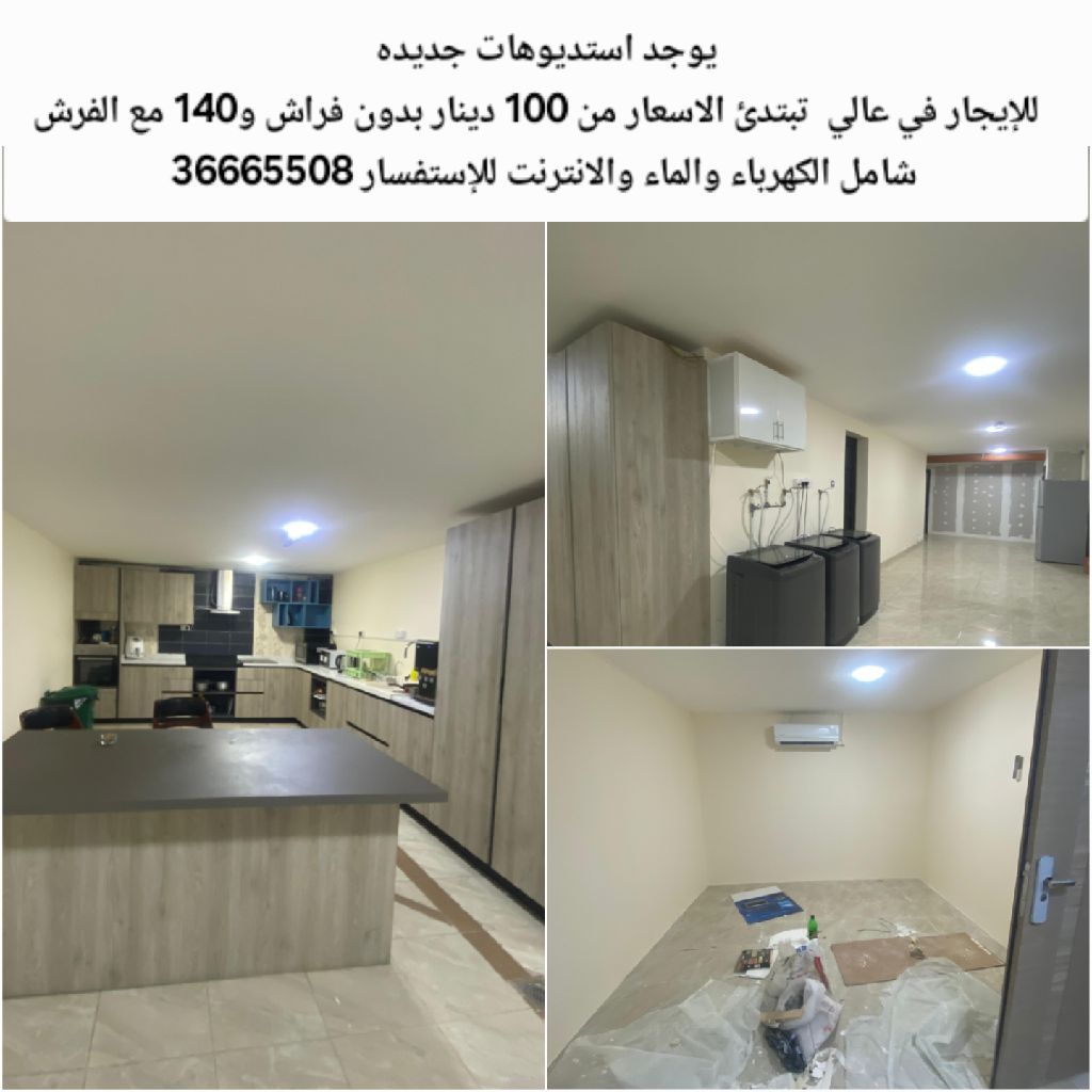New studios for rent in A'ali, with prices starting from 100 dinars without furniture and 140 with furniture, including electricity, water, and internet.