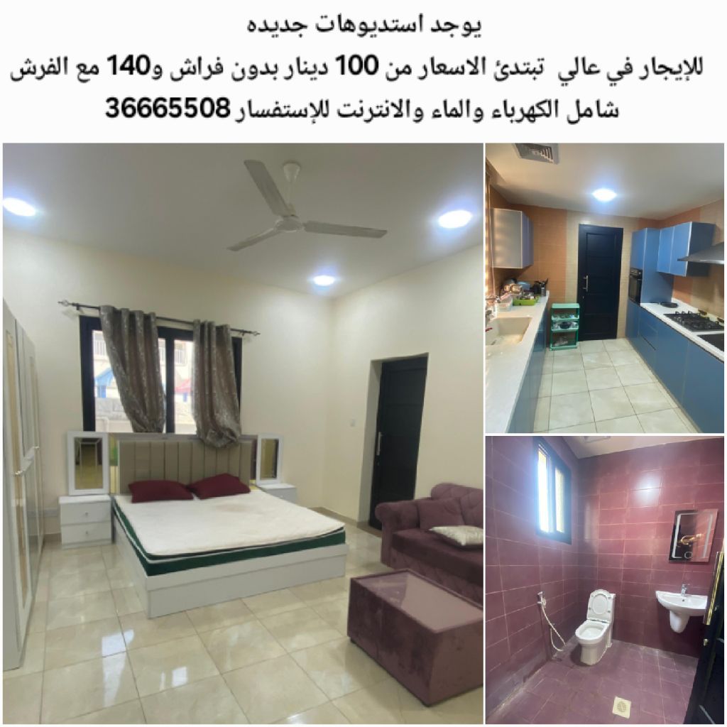 New studios for rent in A'ali, with prices starting from 100 dinars without furniture and 140 with furniture, including electricity, water, and internet.