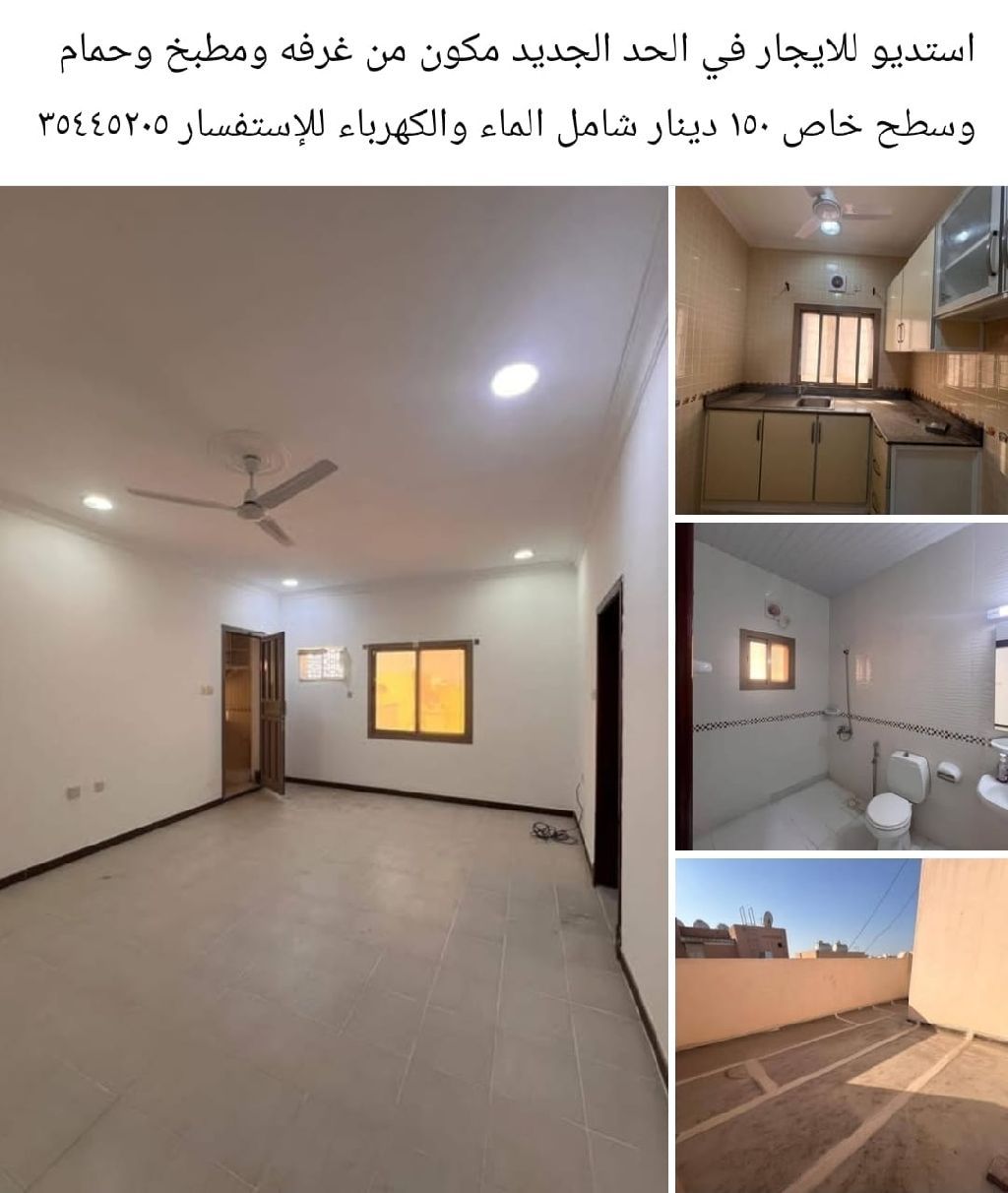 Studio for rent in Al Hidd, consisting of a room, kitchen, bathroom, and private roof, priced at 150 dinars including water and electricity.