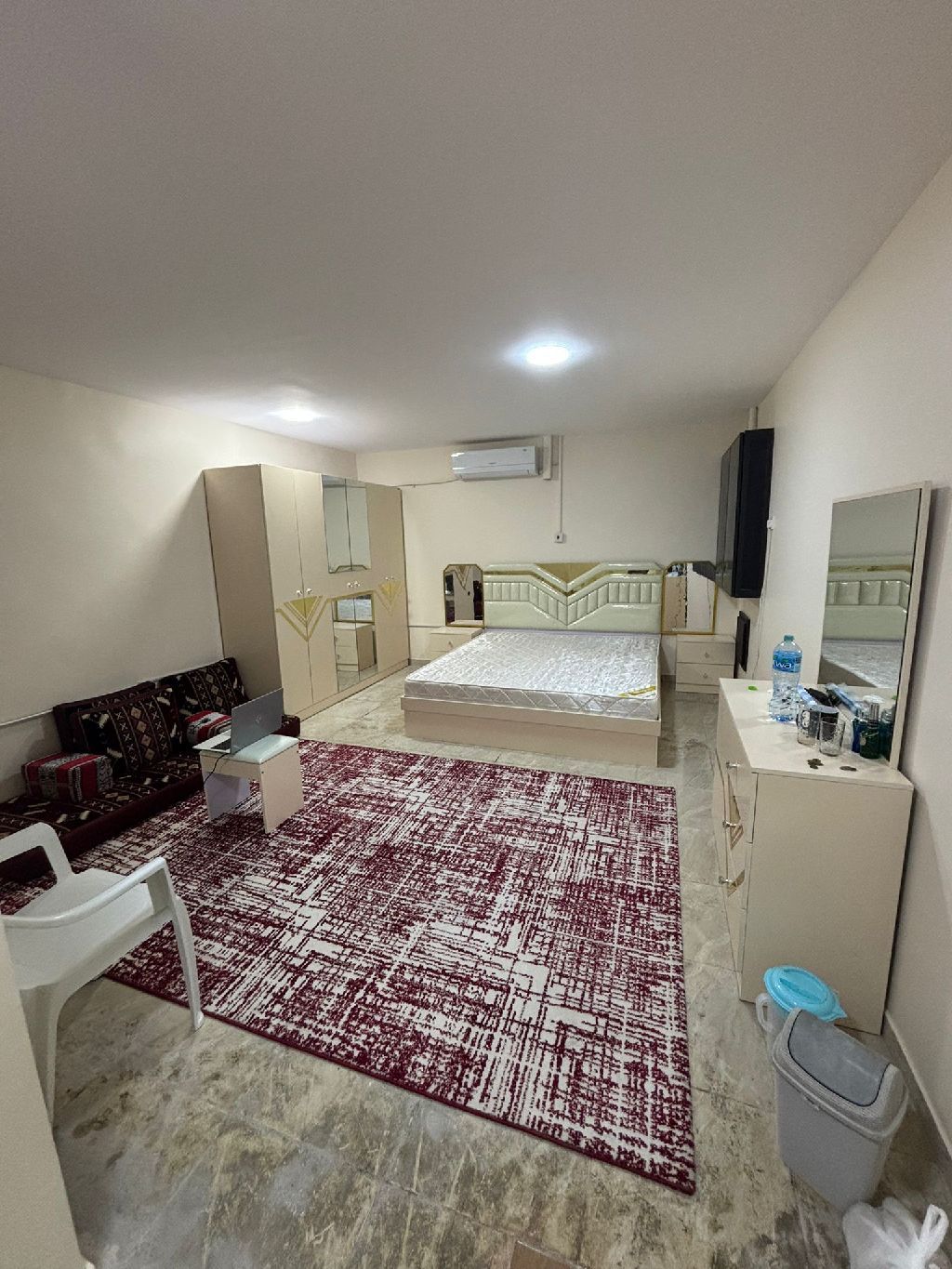 For rent: a spacious room with air conditioning in A'ali, near Lulu Hypermarket (Al-Ramli). Shared bathroom + shared kitchen + free internet + building equipped with surveillance cameras + daily building maintenance + elevator. 100 dinars unfurnished, including electricity and water (suitable for singles). 120 dinars fully furnished, including electricity and water.