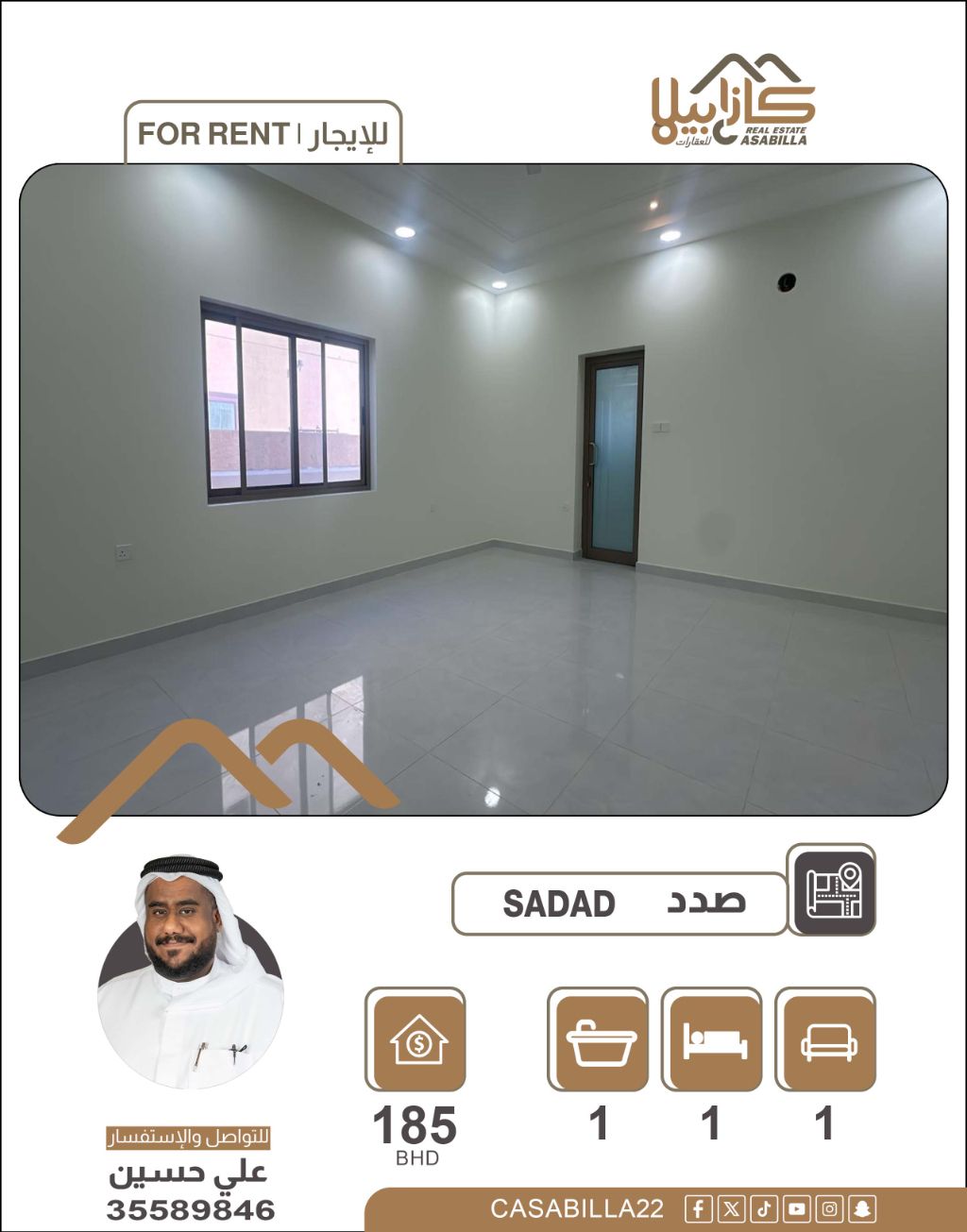 For rent: An elegant studio, brand new and luxurious, in a modern building in the Saddad area. It is characterized by a quiet environment and is close to the Al-Reef Complex and Hamad City. Location: Saddad (near Roundabout 13). Features include a spacious master bedroom, a comfortable living room, a practical kitchen, an additional bathroom for the living room, two parking spaces, a surveillance system, a building guard, an elevator, and free maintenance, including electricity and water. Price: 185 dinars (inclusive). For inquiries, contact for rent in Saddad, studio.