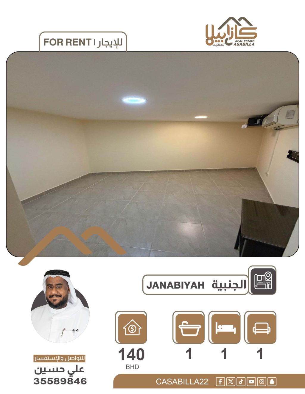 For rent: A distinctive studio in Janabiya with an excellent location near Square Mall, suitable for quiet and comfortable living. Features include security, air conditioning, a water cooler in the summer, and a vibrant location close to services. Rent is only 140 dinars, including electricity, water, and municipality fees. For inquiries and requests, please contact the following numbers. A great opportunity not to be missed.