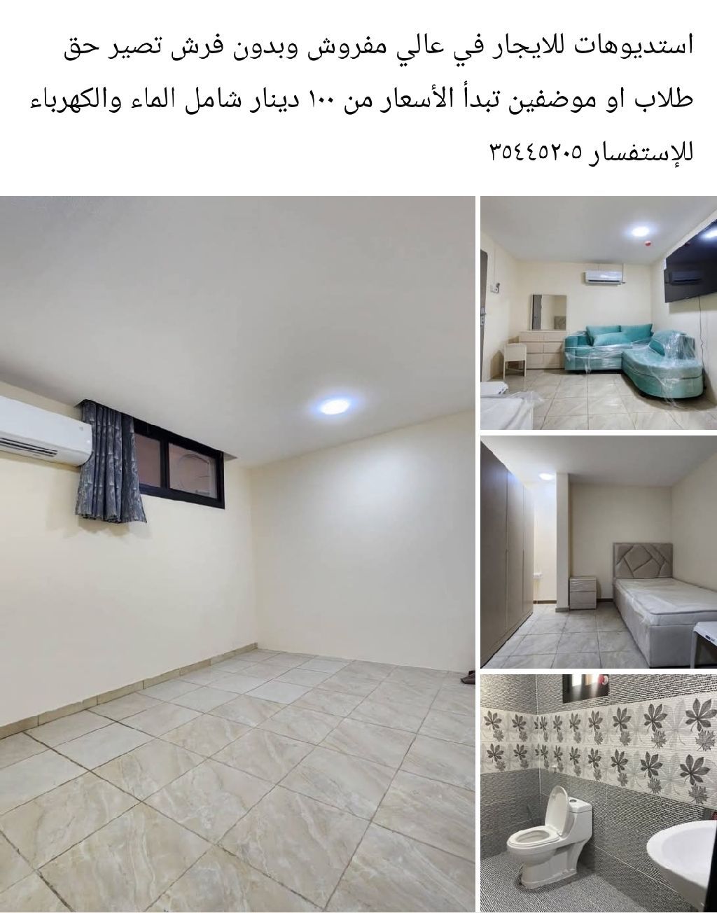 Studios for rent in A'ali, furnished and unfurnished, suitable for students. Prices start from 100 dinars, including water and electricity.