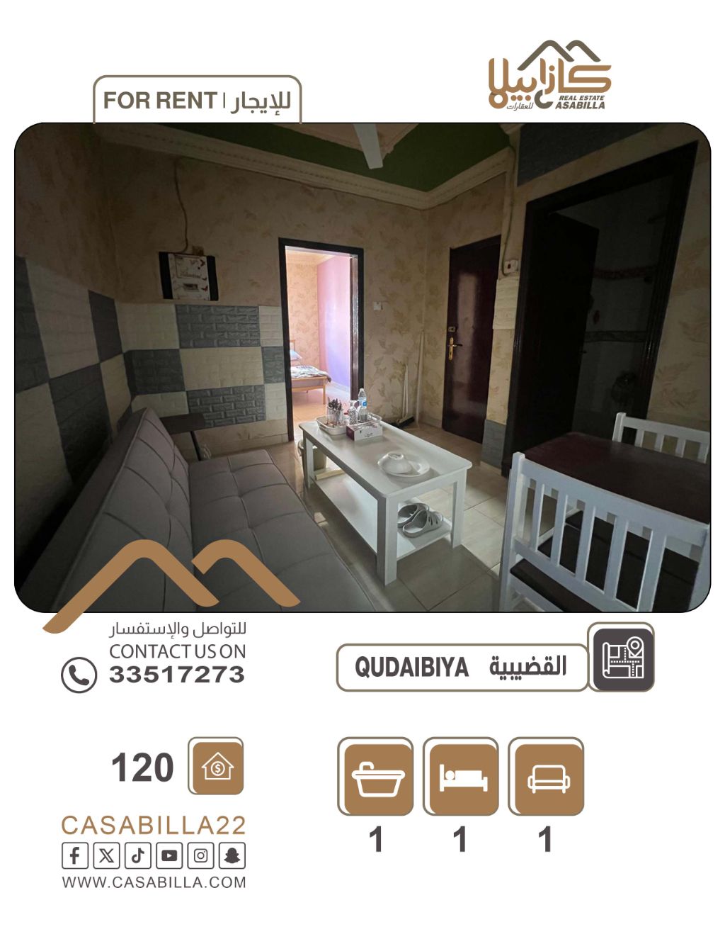 For rent: A fully furnished studio in Al Qudaibiya, Manama. Details: Fully furnished, room with kitchen and bathroom, living area, clean building, quiet and safe location, close to all services. Rent: 120 dinars, excluding electricity and water. For contact.