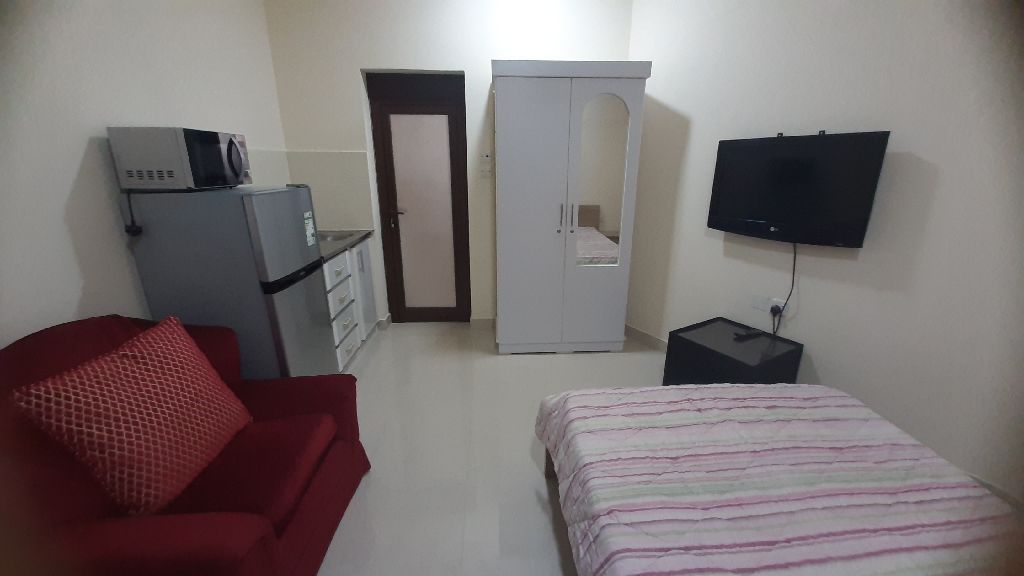 Furnished studio for rent in Jid Ali, new, with a room, bathroom, and open kitchen. Price: 150 dinars, including electricity, for 30 days.