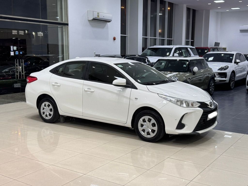 Toyota Yaris 2021 (White) with 42,650 km mileage. Basic options include Bluetooth, sensors, 4 cylinders, 1.5L engine, 5 seats. Price: BD 3,950 (negotiable). Insurance valid until March 2026. Contact for details.