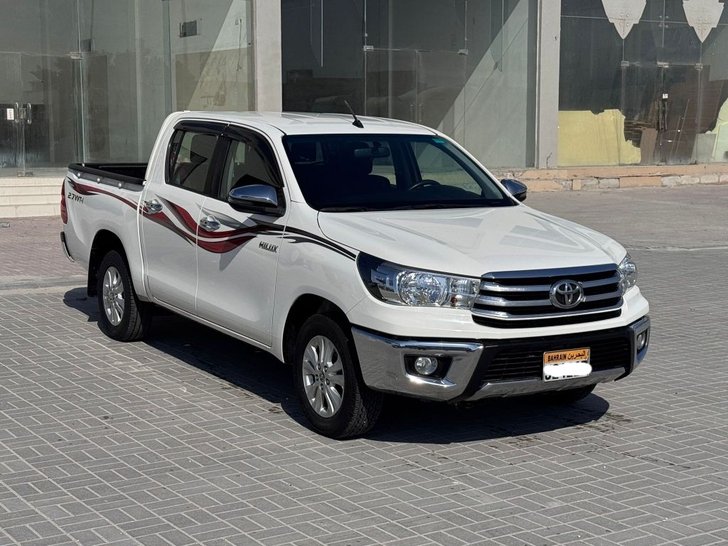 Toyota HiLux SR5 2020 (White) with 75,000 km mileage. Features include alloy wheels, camera, cruise control, sensors, Bluetooth, 4-cylinder 2.7L engine, 5 seats. Price BD 7,200 (negotiable). Insurance valid until September 2026, agent maintained. Contact for details.