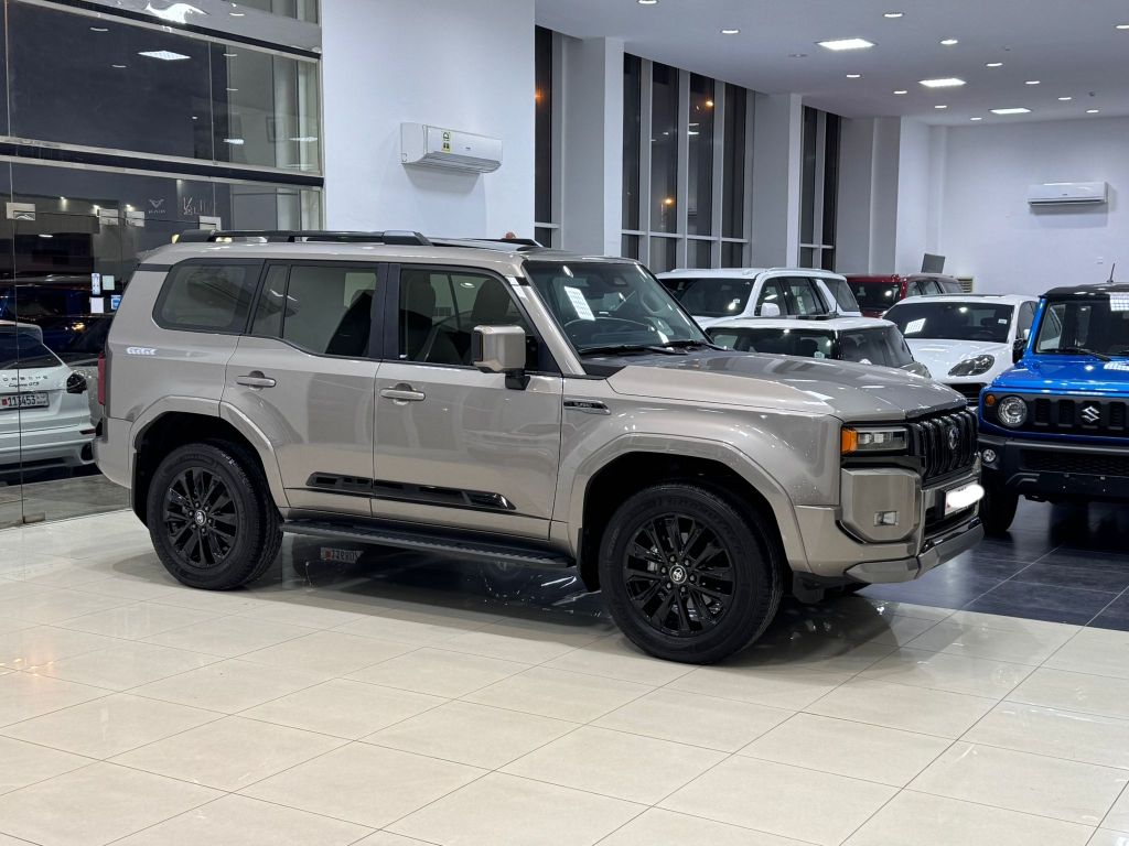 Toyota Prado Turbo Luxury 2025 (Bronze) with 7,850 km mileage. Full options include alloy wheels, Bluetooth, sensors, cruise control, leather seats, push button start, panoramic roof, camera, 4-cylinder 2.4L engine, 7 seats. Price BD23,700 (negotiable). Insurance valid until May 2026, under warranty. Contact for details.