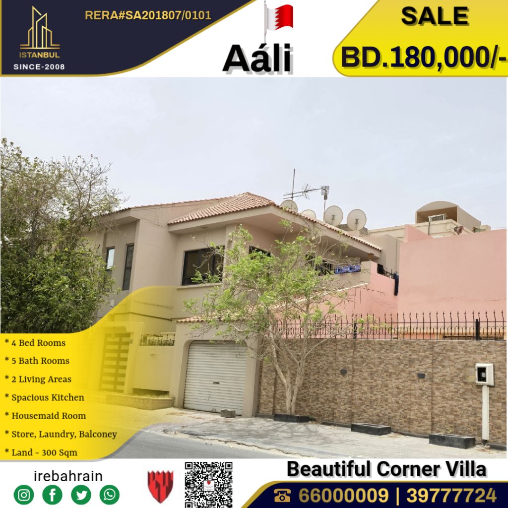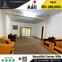 فيلا جميلة على الزاوية للبيع في عالي - 180000 دينار بحريني. فرصة مميزة لامتلاك فيلا واسعة ومجددة بالكامل في موقع استراتيجي بمنطقة عالي، مقابل رام لي مول وبالقرب من مستشفى الإرسالية الأمريكية. الموقع عالي - قطعة زاوية مميزة بمساحة أرض 300 متر مربع. السعر المطلوب 180000 دينار بحريني فقط. 4 غرف نوم، صالتان فسيحتان - مثالية للعائلة والاستقبال. مطبخ مغلق واسع، غرفة خادمة مع حمام خاص، غرفة غسيل، وغرفة