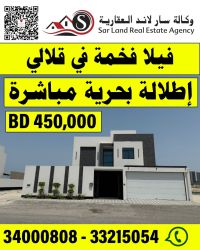 فيلا في قلالي فلتة اطلالة بحرية مباشرة بسعر 450000 دينار للبيع فيلا راقية في قلالي اطلالة بحرية مباشرة مساحة الأرض 513 متر أربع غرف نوم رئيسية مع حمامات مطبخين مجلس مفتوح على صالة وحمام بالدور الأرضي كراج لسيارتين غرفة سائق غرفة عمالة منزلية مع حمام وغرفة غسيل بالدور الثاني بركة سباحة على البحر مباشرة تكييف مركزي مصعد كهربائي مساحة البناء 465 متر 450000 وكالة سار لاند العقارية علي السابودي