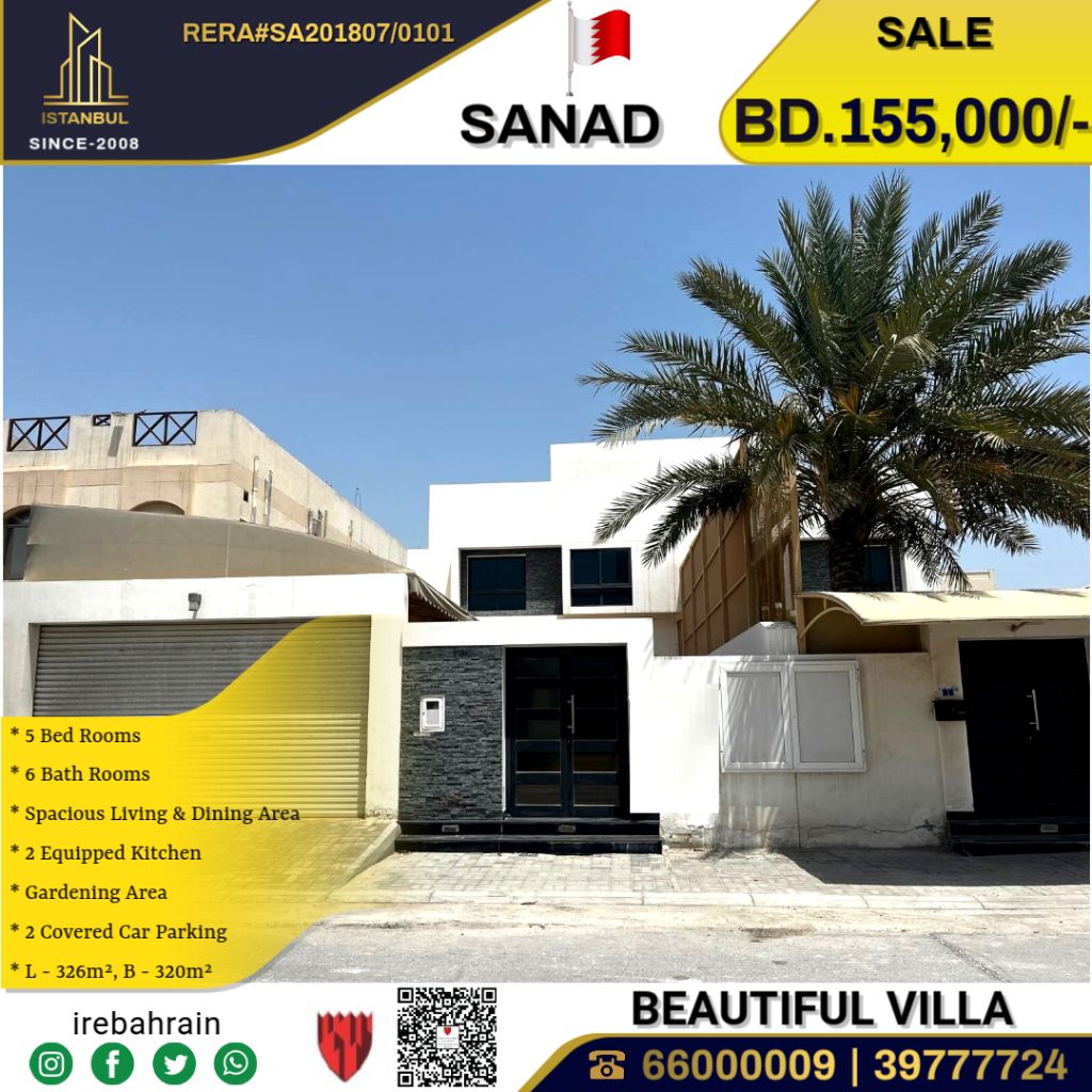 فيلا جميلة للبيع في سند، بسعر 155000 دينار بحريني. تقع هذه الفيلا في سند، وهي منطقة سكنية مميزة. تتكون من 5 غرف نوم، 6 حمامات، صالة معيشة، غرفة طعام، مطبخ أمريكي مجهز بالكامل، مطبخ خارجي، حديقة، موقف سيارة مغطى، وغيرها. مساحة الأرض 326 مترا مربعا، ومساحة البناء 320 مترا مربعا. سعرها أقل من سعر السوق، 155000 دينار بحريني فقط. قريبة من الرفاع، مدينة عيسى، طريق سترة، ألبا، باب كو، وغيرها
