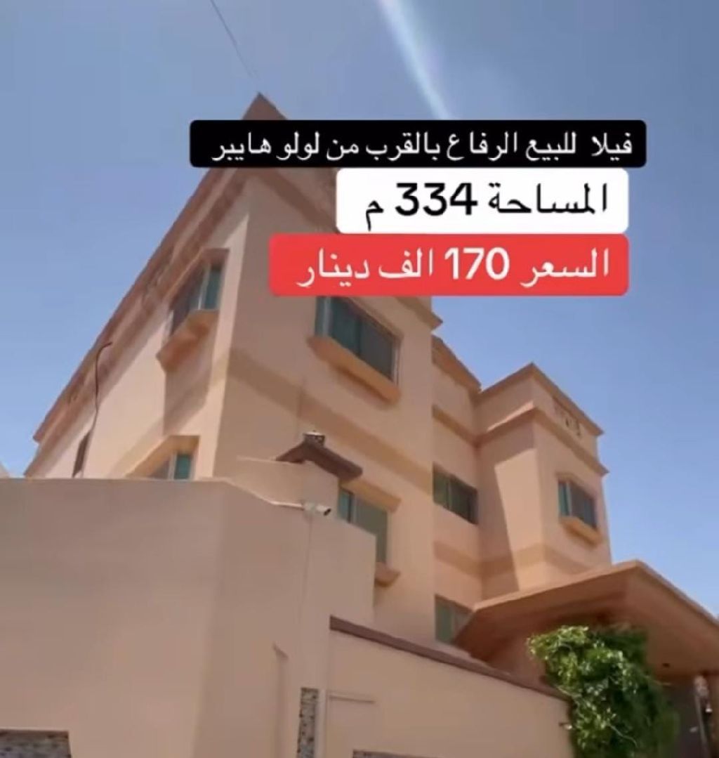 للبيع: فيلا فاخرة تقع في الرفاع الشرقي - بالقرب من هايبر ماركت لولو. المساحة 334 متر مربع. الطابق الأرضي يشمل مجلس، صالتين مفتوحتين متصلتين، حمامين، مطبخ داخلي واسع، مطبخ خارجي، غرفة غسيل، وكراج للسيارات. الطابق الأول يحتوي على ثلاث غرف نوم رئيسية ومطبخ مشترك. الطابق الثاني يحتوي على ثلاث غرف نوم رئيسية ومطبخ مشترك.