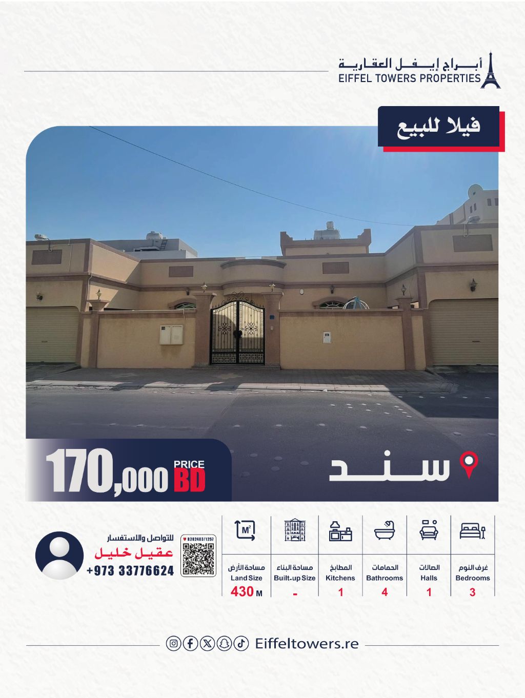 شركة أبراج أيفل العقارية تقدم فيلا للبيع في سند. مساحة الأرض 430 متر مربع. تفاصيل الفيلا: طابق واحد، 3 غرف نوم، صالة واحدة، مطبخ واحد، كراجين، 4 دورات مياه. مميزات الفيلا تشمل مجلس وغرفة خادمة، وهي قريبة من جميع الخدمات. السعر الإجمالي 170,000 دينار بحريني. للتواصل: عقيل خليل.