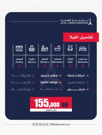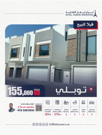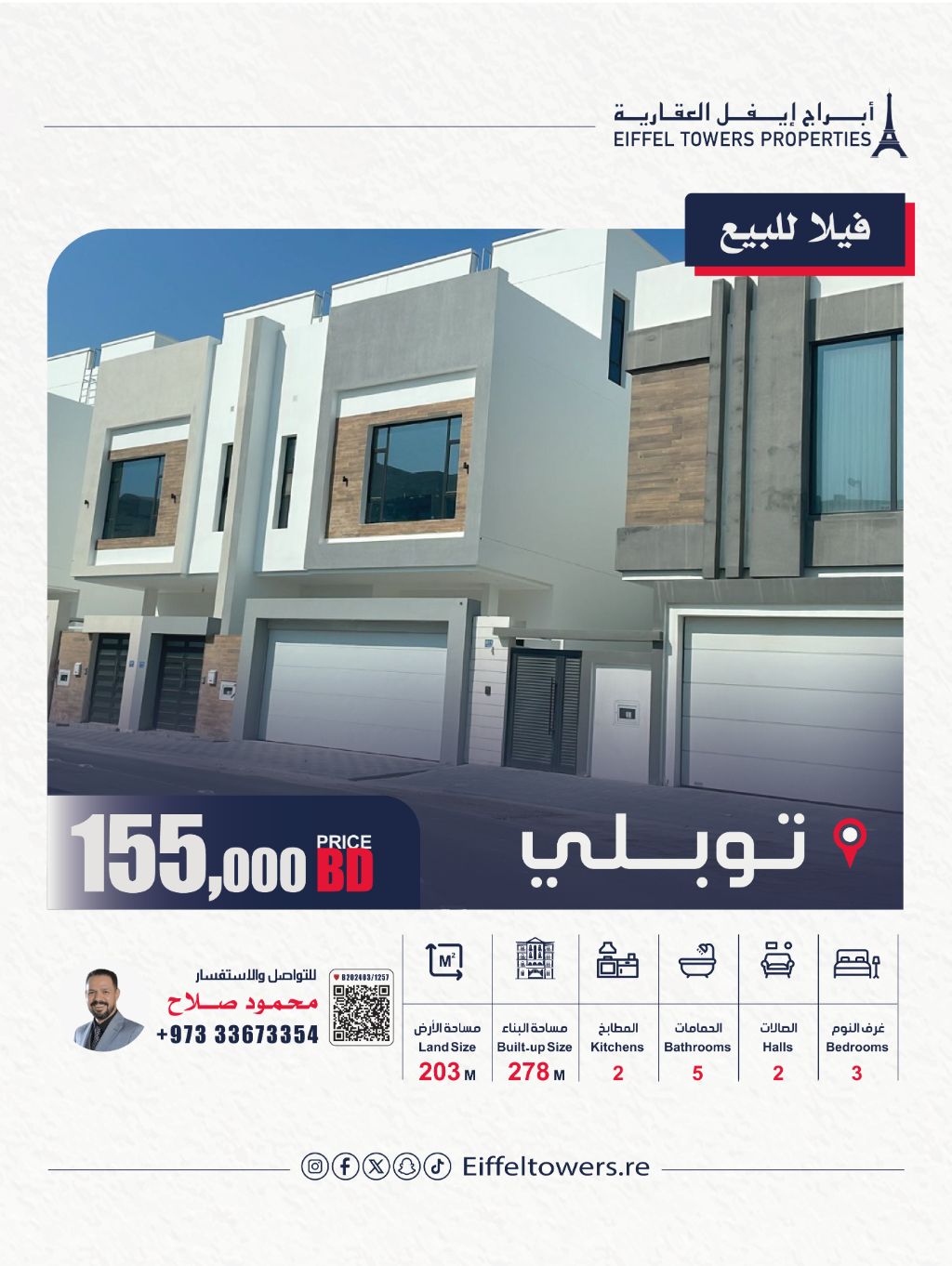 شركة أبراج أيفل العقارية تقدم فيلا للبيع في توبلي. مساحة الأرض 203 متر مربع، ومساحة البناء 278 متر مربع. تتكون من 3 غرف نوم، وصالتين، و5 حمامات، ومطبخين، وموقفين للسيارات، وغرفة خادمة، ومجلس واحد. السعر 155,000 دينار بحريني. للتواصل، اتصل بمحمود صلاح.
