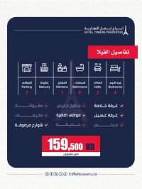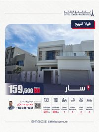 شركة أبراج أيفل العقارية تقدم فيلا للبيع في سار. مساحة الأرض 207 متر مربع، ومساحة البناء 360 متر مربع. تتكون من 4 غرف نوم، وصالتين، و6 حمامات، ومطبخ واحد، وموقفين. مميزات الفيلا تشمل غرفة خادمة، وغرفة غسيل، وشوارع مرصوفة. السعر 159,500 دينار بحريني. للتواصل، اتصل بمحمود صلاح.