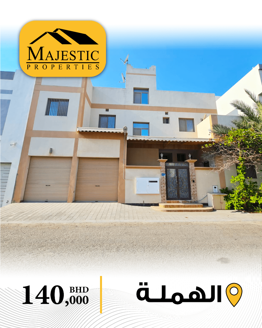 للبيع: بيت في الهملة يتكون من 8 غرف نوم، صالتين، مجلس، مطبخ، غرفة طعام، 7 حمامات، غرفة غسيل، وكراج لسيارتين. مساحة الأرض 302 متر مربع، ومساحة البناء 540 متر مربع. عمر الفيلا 5 سنوات. السعر المطلوب 140,000 دينار بحريني. المرجع: MS402.