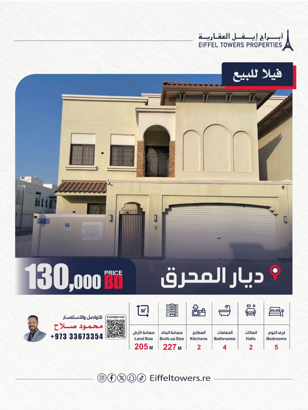 شركة أبراج أيفل العقارية تقدم فيلا للبيع في ديار المحرق - ديرة العيون. مساحة الأرض 205 متر مربع، ومساحة البناء 227 متر مربع. تفاصيل الفيلا: 5 غرف نوم، 2 صالات، 2 مطابخ، 4 دورات مياه، 2 مواقف سيارات، غرفة غسيل، مخزن، حديقة مأثثة بالكامل، تقع على شارعين وزاوية، بالقرب من جميع الخدمات. السعر الإجمالي: 130,000 دينار بحريني. للتواصل: محمود صلاح.