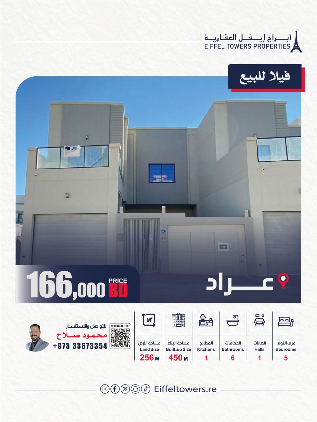 شركة أبراج أيفل العقارية تقدم فيلا للبيع في عراد. مساحة الأرض 256 متر مربع، ومساحة البناء 450 متر مربع. تفاصيل الفيلا: 5 غرف نوم، صالة واحدة، مطبخ واحد، 6 دورات مياه، موقفان للسيارات، غرفة غسيل، غرفة خادمة، حديقة، وقريبة من جميع الخدمات. السعر الإجمالي 166,000 دينار بحريني. للتواصل: محمود صلاح.