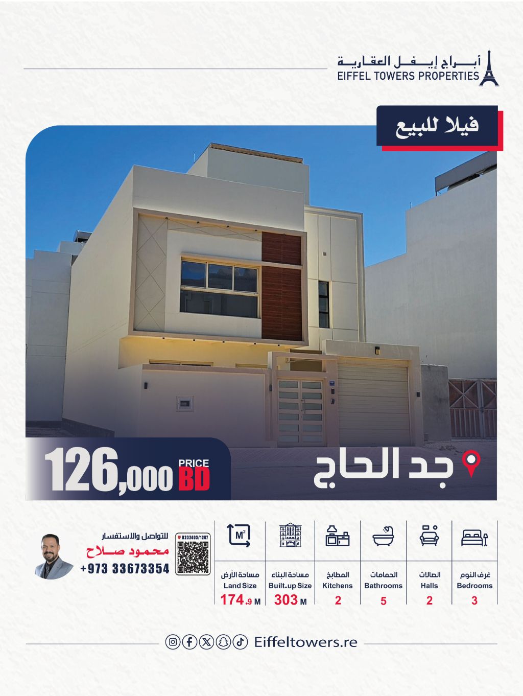 شركة أبراج أيفل العقارية تقدم فيلا للبيع في جد الحاج. مساحة الأرض 174.9 متر مربع، ومساحة البناء 303 متر مربع. تفاصيل الفيلا: 3 غرف نوم، 2 صالات، 2 مطابخ، 5 دورات مياه، و2 موقف سيارات. السعر الإجمالي 126,000 دينار بحريني. للتواصل: محمود صلاح، eiffeltowers-re، eiffeltowers.re. وسيط معتمد من قبل مؤسسة التنظيم العقاري، رقم الترخيص B202403/1257.