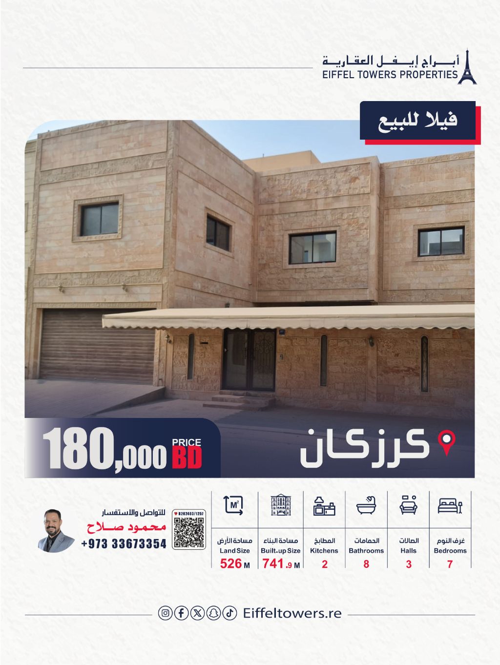 شركة أبراج أيفل العقارية تعرض فيلا للبيع في كرزكان - حي الحسن. مساحة الأرض 526 متر مربع، ومساحة البناء 741.9 متر مربع. تتكون من 7 غرف نوم، 3 صالات، 8 حمامات، 2 مطابخ، و2 موقف سيارات. مميزات إضافية للبيت تشمل 4 مخازن، غرفة غسيل، حديقة أمامية وخلفية، جلسة خارجية، وغرفة خادمة. السعر 180,000 دينار بحريني. للتواصل: محمود صلاح، eiffeltowers - re، eiffeltowers.re، وسيط معتمد من قبل مؤسسة التنظيم العقاري برقم الترخيص B202403 / 1257.