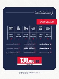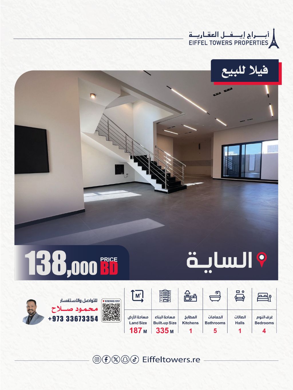 شركة أبراج إيفل العقارية تقدم فيلا للبيع في الساية. مساحة الأرض 187 متر مربع، ومساحة البناء 335 متر مربع. تفاصيل الفيلا: 4 غرف نوم، صالة واحدة، مطبخ واحد، 5 دورات مياه، موقفين للسيارات، وغرفة خادمة مع حمام. السعر الإجمالي 138,000 دينار بحريني. للتواصل: محمود صلاح، eiffeltowers-re، eiffeltowers.re. وسيط معتمد من قبل مؤسسة التنظيم العقاري، رقم الترخيص B202403/1257.