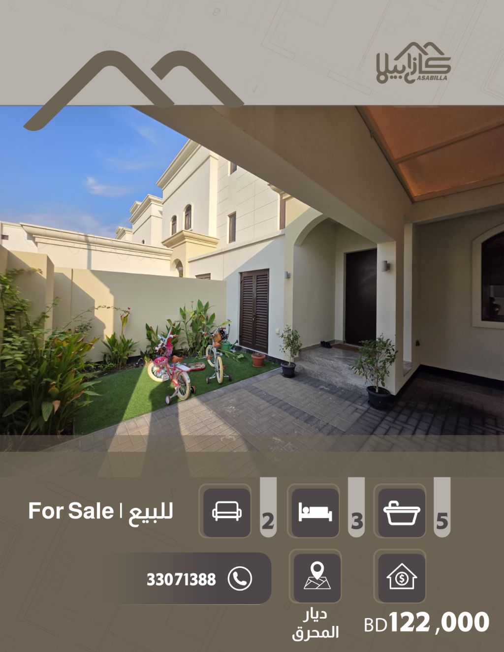 للبيع: فيلا في ديار المحرق، في منطقة جوان. أولاً، تفاصيل الفيلا: صالتان، مطبخان (داخلي وخارجي)، 3 غرف نوم ماستر، حمامان، غرفة خادمة مع حمام، غرفة غسيل ملابس. ثانياً، المرافق والخدمات: مكيفات سبليت، كراج لسيارتين، حوش، بناء مودرن، تشطيبات عالية الجودة. ثالثاً، المساحات والسعر: مساحة الأرض 185 متر مربع، مساحة البناء 230 متر مربع، السعر الإجمالي 122 ألف دينار بحريني. للاتصال.