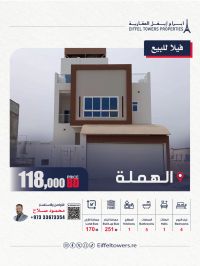 شركة أبراج أيفل العقارية للبيع: بيت في الهملة بمساحة أرض 170 متر مربع ومساحة بناء 251 متر مربع. تفاصيل الفيلا: طابقين، 4 غرف نوم، صالة واحدة، مطبخ واحد، 5 دورات مياه، وموقفين للسيارات. مميزات إضافية: منطقة غسيل، شوارع مرصوفة، وقرب من جميع الخدمات. السعر الإجمالي: 118,000 دينار بحريني. للتواصل: محمود صلاح، eiffeltowers.re، eiffeltowers.re، وسيط معتمد من قبل مؤسسة التنظيم العقاري برقم الترخيص B202403/1257.