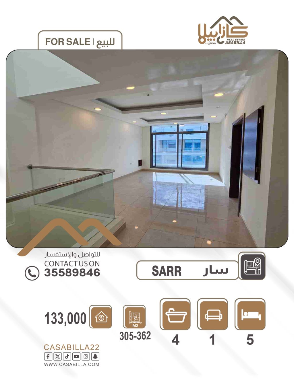 فلل عصرية للبيع في سار - فرصة محدودة لامتلاك فيلا أحلامك بسعر 133,000 فقط ضمن مجمع سكني خاص يضم 14 فيلا فقط، ولم يتبق سوى 5 وحدات. مواصفات مميزة: 5 غرف نوم، 4 حمامات، تصميم ذكي على 3 طوابق، صالة معيشة واسعة + منطقة طعام، مطبخ داخلي وآخر خارجي، حديقة خاصة، موقف سيارات مغطى، صالة عائلية، شرفة واسعة على السطح. مساحات البناء من 305 إلى 362.9 متر مربع. الموقع: سار - من أكثر المناطق طلباً. التملك متاح للبحرينيين ومواطني دول مجلس التعاون الخليجي.