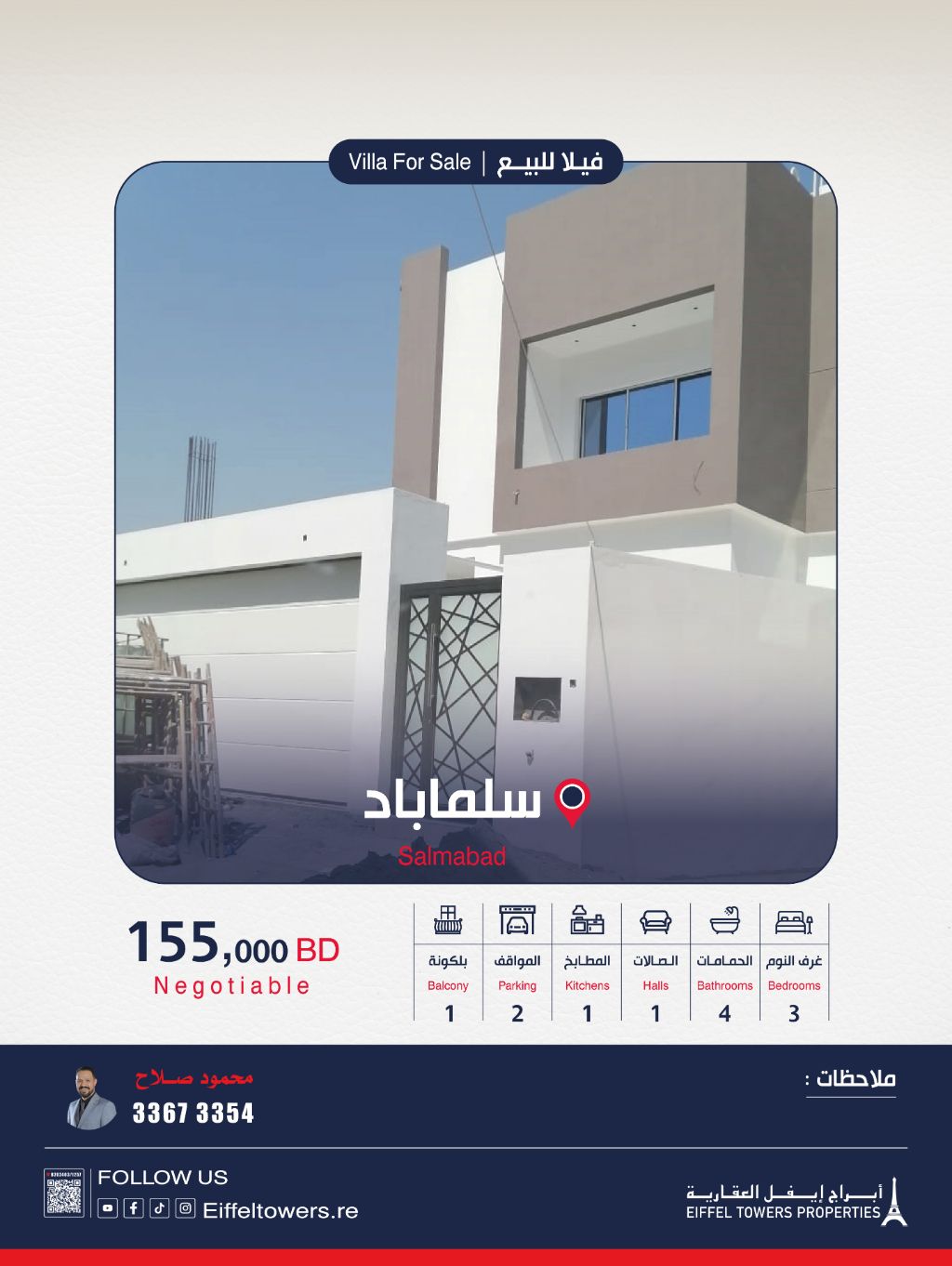 شركة أبراج أيفل العقارية تقدم فيلا جديدة للبيع في سلماباد. مساحة الأرض: 319.5 متر مربع. مساحة البناء: 336 متر مربع. تفاصيل الفيلا: تتكون من طابقين، تحتوي على 3 غرف نوم، 1 صالة، 1 مطبخ، 4 دورات مياه، و2 موقف سيارات. مميزات إضافية: غرفة غسيل، غرفة تبديل، قريبة من جميع الخدمات. السعر الإجمالي: 155,000 دينار بحريني. للتواصل: محمود صلاح، eiffeltowers - re، eiffeltowers.re، وسيط معتمد من قبل مؤسسة التنظيم العقاري.