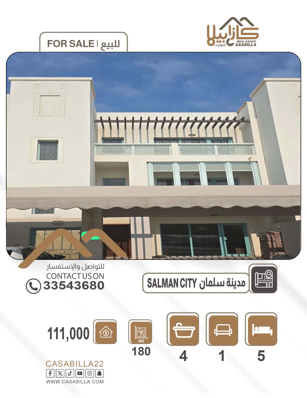 للبيع فيلا في مدينة سلمان بإطلالة على البحر بسعر مميز. تفاصيل الفيلا: الطابق الأرضي: مجلس، صالة، حمام، مطبخ، مخزن، حوش خلفي. الطابق الأول: 3 غرف (1 ماستر)، 2 حمام. الطابق الثاني: غرفة وحمام. السطح: يمكن البناء غرفة أو مطبخ. المرافق والخدمات: موقف داخلي، بلكونتين مطلة على البحر، أمام البيت مواقف تكفي لـ 5 سيارات. مساحة الأرض: 180 متر مربع. مساحة البناء: 265 متر مربع. السعر: 111 ألف دينار. للتواصل.