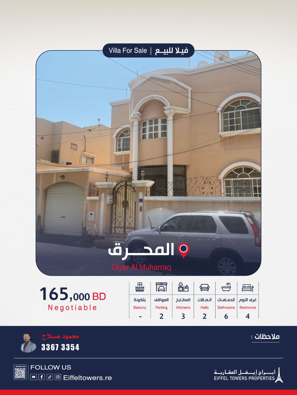 شركة أبراج أيفل العقارية تقدم فيلا جديدة للبيع في المحرق. مساحة الأرض 335 متر مربع. تفاصيل الفيلا: طابقين، 4 غرف نوم، 2 صالات، 3 مطابخ، 6 دورات مياه، و2 موقف سيارات. مميزات إضافية: منطقة غسيل، على شارعين، وقريبة من جميع الخدمات. السعر الإجمالي: 165,000 دينار بحريني. للتواصل: محمود صلاح، eiffeltowers.re، eiffeltowers.re. وسيط مرخص ومعتمد من قبل مؤسسة التنظيم العقاري، رقم الترخيص B202403/1257.