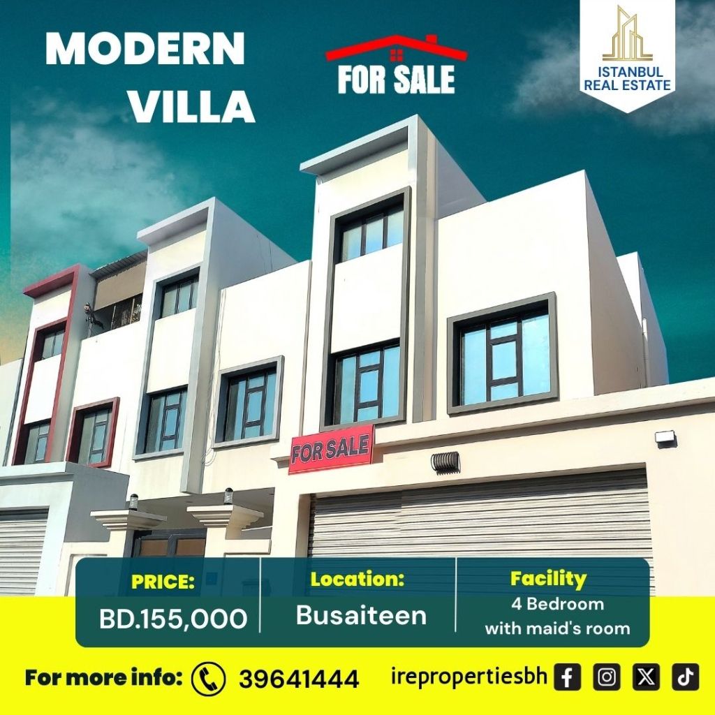 فيلا مفروشة للبيع في البسيتين بسعر 155,000 دينار بحريني. فرصة ممتازة في البسيتين: فيلا مفروشة مكونة من 4 غرف نوم وجاهزة للسكن، تتألف من 4 غرف نوم، 5 حمامات، مناطق معيشة واسعة، مطبخين (داخلي وخارجي)، غرفة خادمة مع حمام، غرفة غسيل ومخزن، موقف سيارات يتسع لسيارتين. استمتع بسهولة الوصول إلى المطار والمحرق وجزر أمواج وغيرها. مساحة الأرض 192 متر مربع. مثالية للعائلات التي تبحث عن الرفاهية والراحة. السعر: 155,000 دينار.