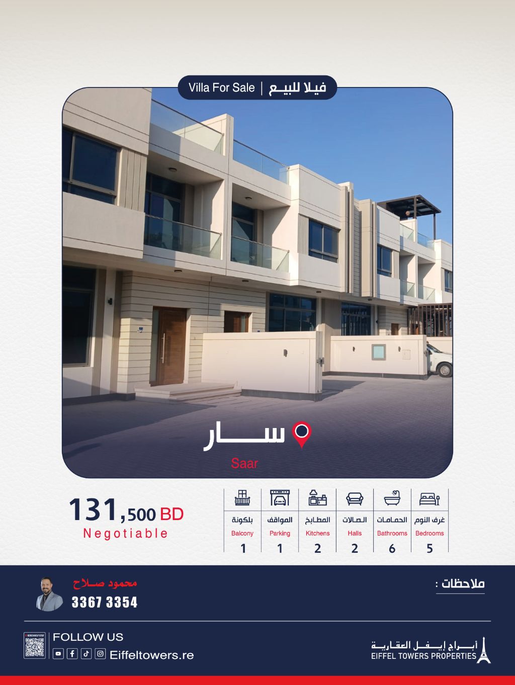 شركة أبراج إيفل العقارية تعرض فيلا للبيع في سار. مساحة الأرض: 200 متر مربع. مساحة البناء: 305 متر مربع. تفاصيل الفيلا: 5 غرف نوم، 2 صالات، 2 مطابخ، 6 دورات مياه، 1 موقف سيارات. مميزات إضافية: مساحة حديقة، غرفة طعام، قريبة من جميع الخدمات. السعر الإجمالي: 131,500 دينار بحريني. للتواصل: محمود صلاح. شركة أبراج إيفل العقارية وسيط معتمد من قبل مؤسسة التنظيم العقاري، رقم الترخيص B202403/1257.