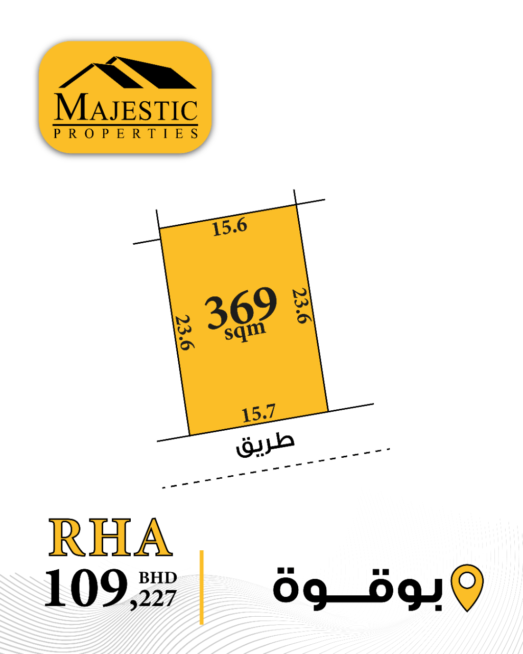 للبيع: أرض سكنية في بو قوة بالقرب من مخطط الروضة وسرايا 2. تصنيف الأرض RHA. مساحة الأرض 369 متر مربع. سعر القدم المربع 27.5 دينار بحريني. السعر الإجمالي 109,227 دينار بحريني. المرجع: MPM3317.