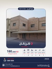 شركة أبراج أيفل العقارية تعرض فيلا للبيع في كرزكان - حي الحسن. مساحة الأرض: 526 متر مربع. مساحة البناء: 741.9 متر مربع. تتكون من 7 غرف، 3 صالات، 8 حمامات، 2 مطابخ، و2 موقف للسيارات. مميزات إضافية للبيت تشمل 4 مخازن، غرفة غسيل، حديقة أمامية وخلفية، جلسة خارجية، وغرفة خادمة. السعر: 180,000 دينار بحريني. للتواصل: محمود صلاح، eiffeltowers.re، eiffeltowers.re. وسيط مرخص ومعتمد من قبل مؤسسة التنظيم العقاري، رقم الترخيص B202403/1257.