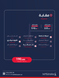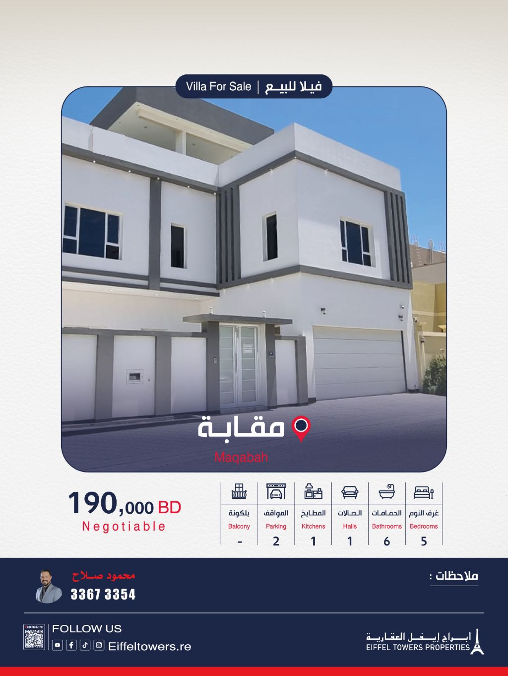 شركة أبراج أيفل العقارية تقدم فيلا للبيع في مقابة. مساحة الأرض: 335.8 متر مربع. مساحة البناء: 510 متر مربع. تفاصيل الفيلا: 5 غرف نوم، 1 صالة، 1 مطبخ، 6 دورات مياه، 2 موقف سيارات. المميزات: حديقة، غرفة خادمة، تكييف مركزي، صالات مفتوحة بالطابق الأرضي، درج رخام. السعر الإجمالي: 190,000 دينار بحريني. للتواصل: محمود صلاح. أبراج أيفل العقارية وسيط معتمد من قبل مؤسسة التنظيم العقاري، رقم الترخيص B202403/1257.